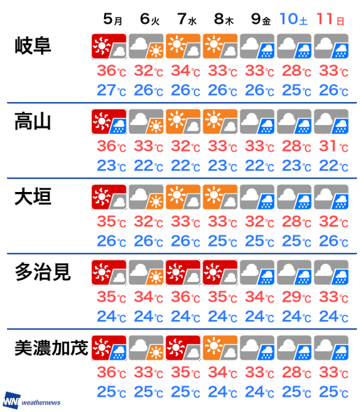 木曜日頃までは、真夏の強い日差しが照り付けます。昼間は厳しい暑さで、夜も気温はあまり下がらず熱帯夜となるところも。昼夜問わず熱中症対策が欠かせません。