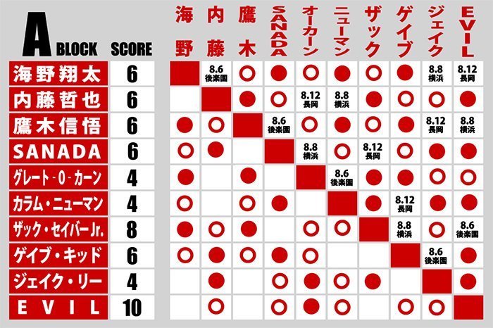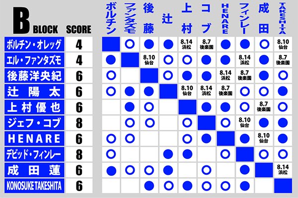 この結果、Bブロックはコブとフィンレーが4勝2敗で首位タイ。そのあとを3勝3敗で後藤、辻、上村、HENARE、成田、TAKESHITAの6人が続く展開に。
